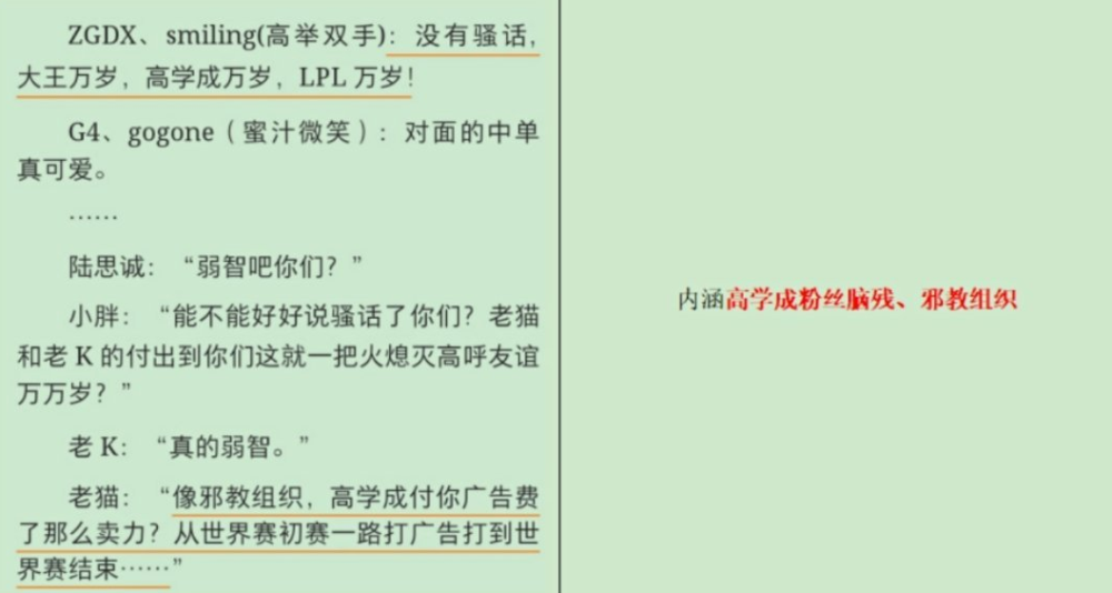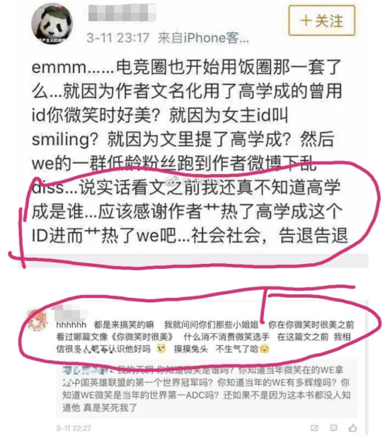 而且之前书粉和LOL粉的对撕也从侧面激化了矛盾。LOL玩家挂出对方的言论,有书粉表示“就因为文中提到女主叫Smilin(微笑的英文),就因为提了高学成,WE的低龄粉丝就到作者微博下乱Diss”