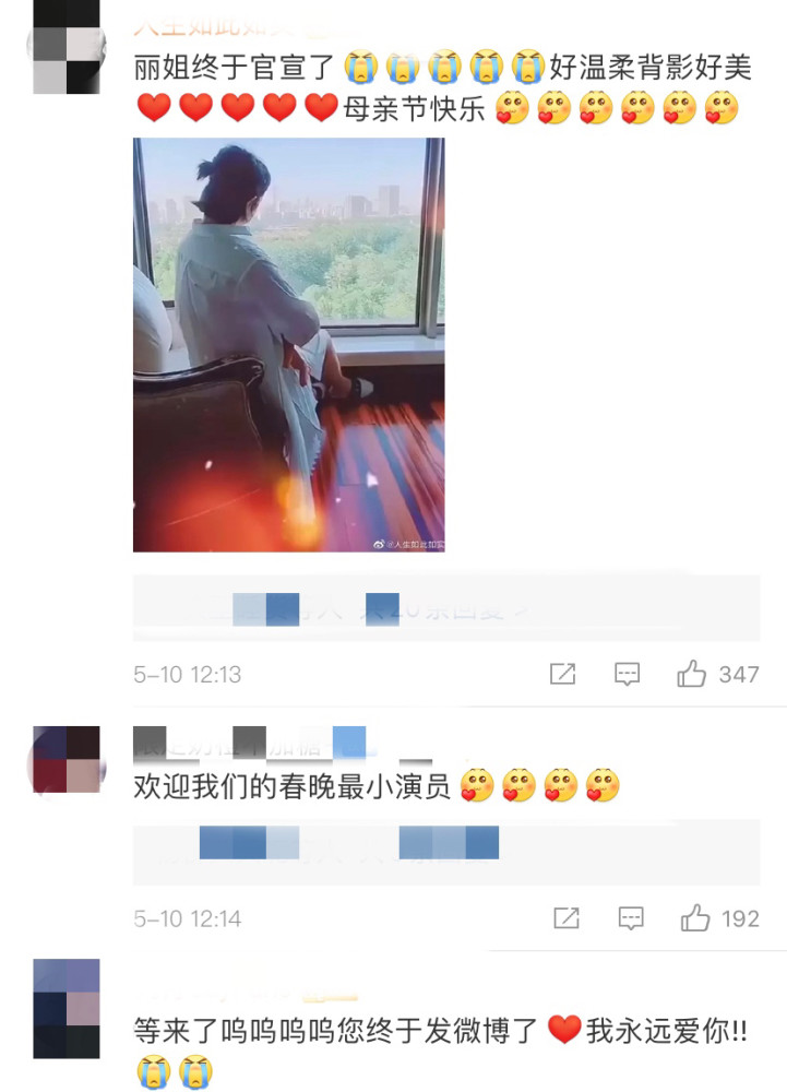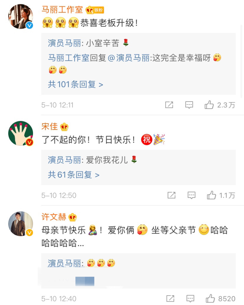 从马丽的动态中可以得知,马丽已经成功生下了小宝宝,因为她称这是她第一个母亲节。而今天又是这样特殊的节日,马丽决定与大家一起分享这个快乐的消息,跟大家在这样欢乐的节日氛围中体验当母亲的快乐和幸福。网友们得知马丽终于生下小宝宝的消息以后纷纷送上真挚的祝福,有网友打趣称:“欢迎我们春晚最小的演员”,因为马丽在怀孕时参加了春晚,一起和沈腾合作表演了小品,所以马丽肚子里的小宝宝也很荣幸地成为了春晚舞台上最小的演员。演员宋佳也在这个特殊的时刻送上祝福,她称:“了不起的你,节日快乐!”随后马丽也友好地给予了回应:“爱你我花儿”。小宝宝的父亲许文赫也评论道:“母亲节快乐,爱你两,坐等父亲节。”许文赫当爹的激动溢于言表。