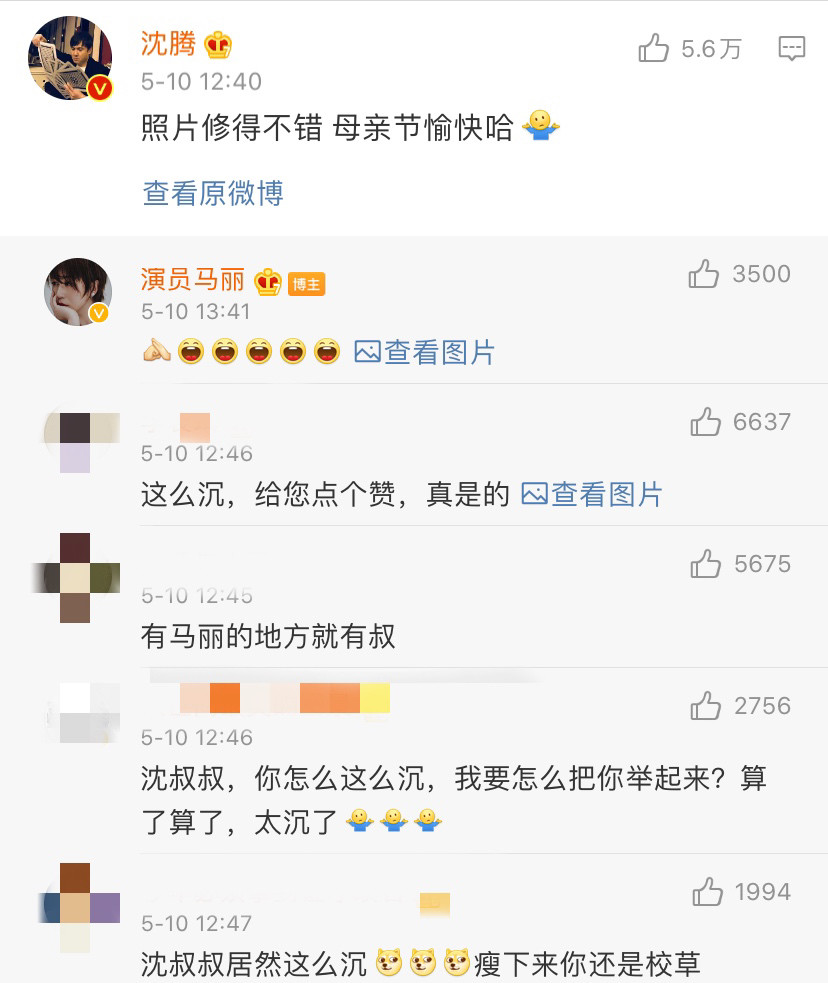评论区本是一片温馨与幸福,而有马丽的地方怎么能没有沈腾呢?沈腾毫无悬念地出现在了评论区,而他还是一如既往的搞笑,他的评论中都带有诙谐和幽默。他评论道:“照片修得不错,母亲节愉快哈。”看到自己好朋友马丽如今已经当了母亲,沈腾心中想必也是感到高兴的,他和马丽这一对“冤家”曾给我们带来了数不尽的欢乐,而就在今天这样的特殊日子里,沈腾也不忘损一损马丽,不过他还是给马丽送上了最真挚的祝福。而马丽收到了沈腾别样的祝福之后,回应了一个佩服的表情和一连串哈哈大笑的表情。并且还晒出了一张沈腾的照片,二人开始逗乐,非常有意思。