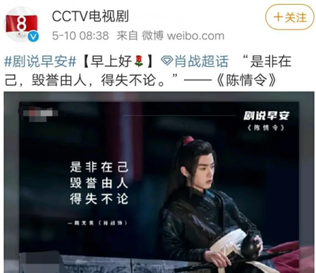 对此,央视电视剧用《陈情令》中的一句话表达了对于肖战的看法:“是非在己,毁誉由人,得失不论”,短短16字可以说是意味深长,但也是对肖战的侧面鼓励。
