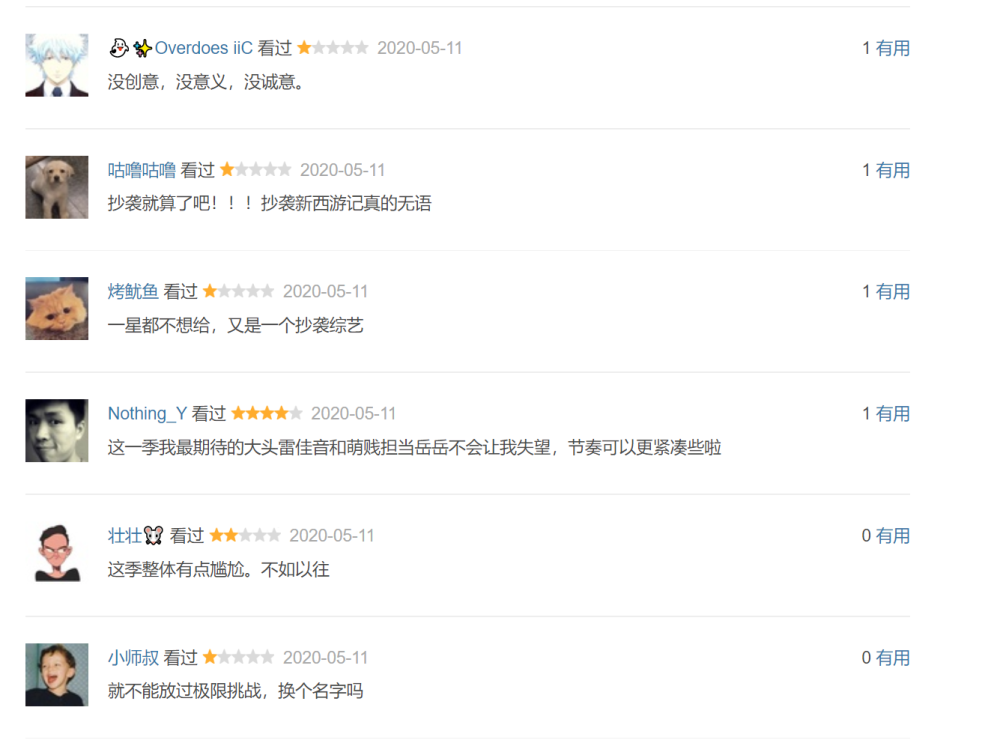 截止到发稿,豆瓣几乎满屏的一星和两星,除了阵容外,网友们更多吐槽的是节目本身。