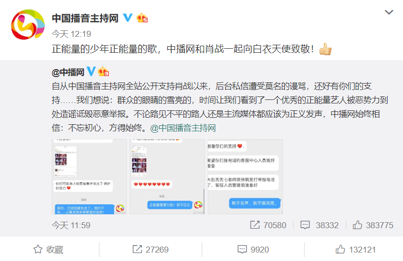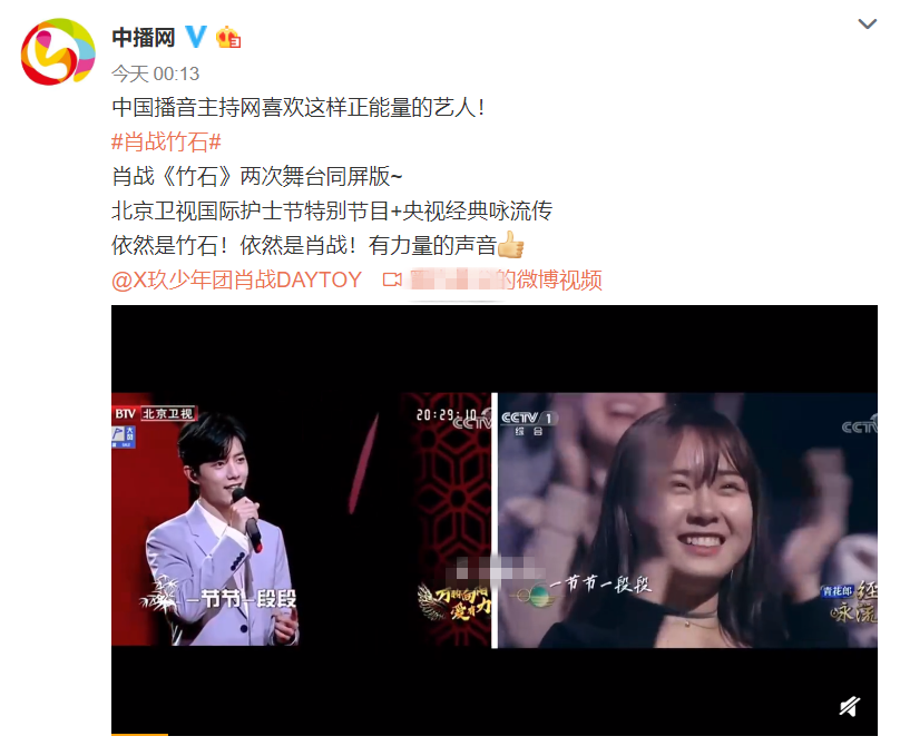 而日前更是迎来母亲节,肖战本人也是登上北京卫视特别节目,并为所有白衣天使致敬的经典歌曲《竹石》,不多时,肖战演唱竹石的相关话题便登上热搜,同时,包括两大播音类主流媒体在内,也是纷纷发声为肖战声援,虽然官博中途也一度因为“站队”的偏向性而引起网友质疑,但他们依然坚持立场,表态会与肖战一起传播真正的正能量。