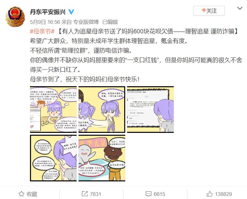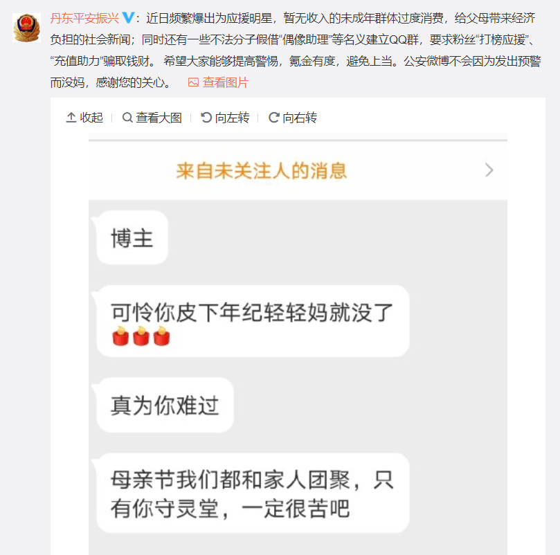 但俗话说,越怕什么越来什么,不久前,丹东警方官微就发文并举出诸多诈骗案例,倡导广大群众,特别是未成年学生群体在母亲节这天理智追星,谨防电信诈骗。