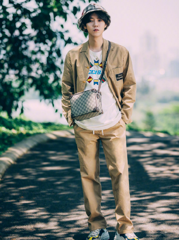 不论在哪里鹿晗都很喜欢用一个帽子来增加自己的时髦度,这一身的浅褐色工装外套加上同色系的裤装,内搭采用的是有着多种国旗印花的白T,再加上一双运动鞋。将工装风格和休闲运动风格很好地融合到了一起,最让人感到特别的是这一个有着复古印花加持的包包携带在一起,非常有特色了。