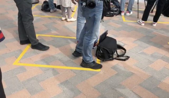 疫情期间,防护工作必须做到位。就连记者采访的区域也被划了黄色的方块格子,以控制安全距离。