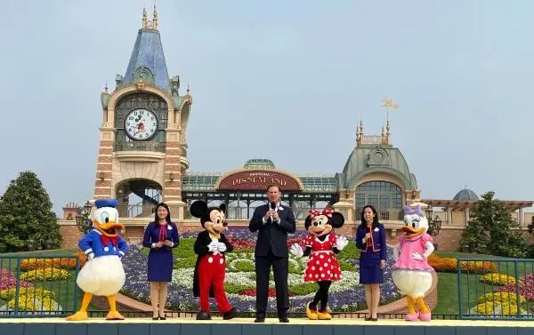 今早在乐园正式开园之前,一场特别的庆祝仪式在换上春季新装的“花样米妮”花坛前举行。