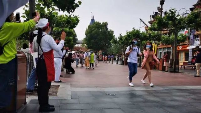 上海迪士尼乐园主入口米奇大道上,上海迪士尼乐园的员工们列成两队,挥舞着手中的手套,对每一位进园的游客说着,“欢迎回来!”