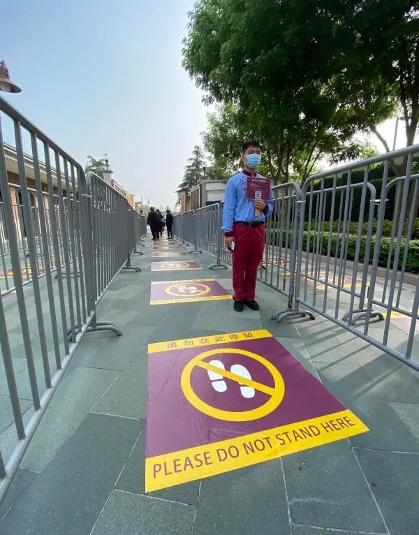 具体到每个游乐项目,以晶彩奇航为例,在排队区域,栏杆上贴了许多黄色的标记,这个就是安全距离的标识。