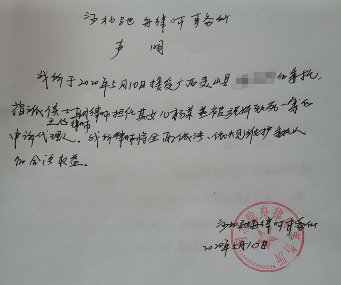 侯士朝律师发给记者的一份律师声明显示,5月10日被害女童家属已委托河北驰舟律师事务所的侯士朝、王飞律师担任此案申诉代理人。