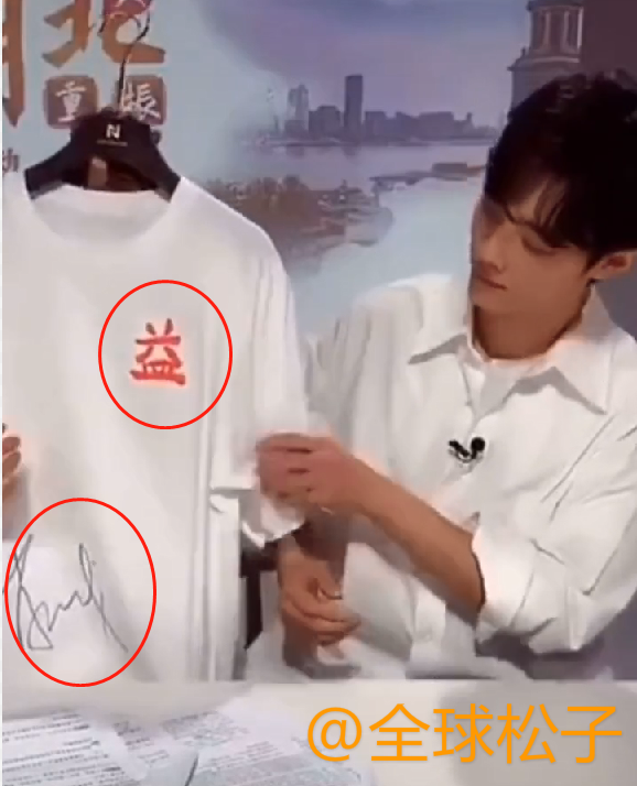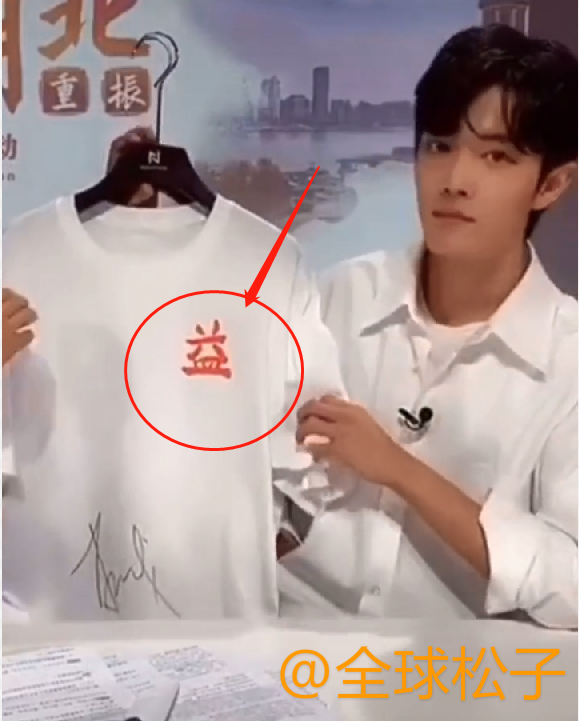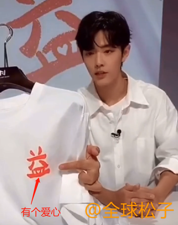既然是为公益直播,肖战也在直播中带来自己为公益设计的T恤,并在直播中展示出来。肖战设计的这件T恤,看上去很简约,只是在衣服的左上方有一个公益的“益”字。这个“益”是肖战亲手写的,然后将下面稍加改动,变成了一个“爱心”的形状,不愧是设计师啊。