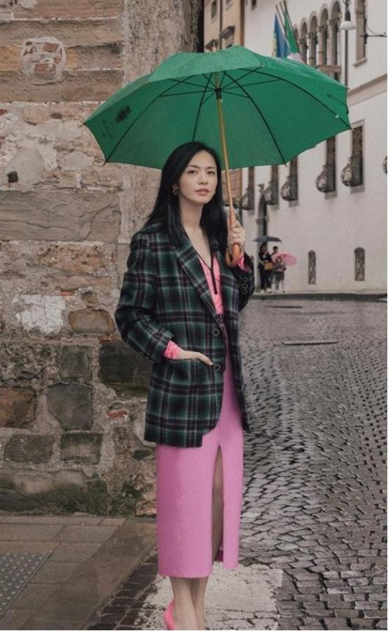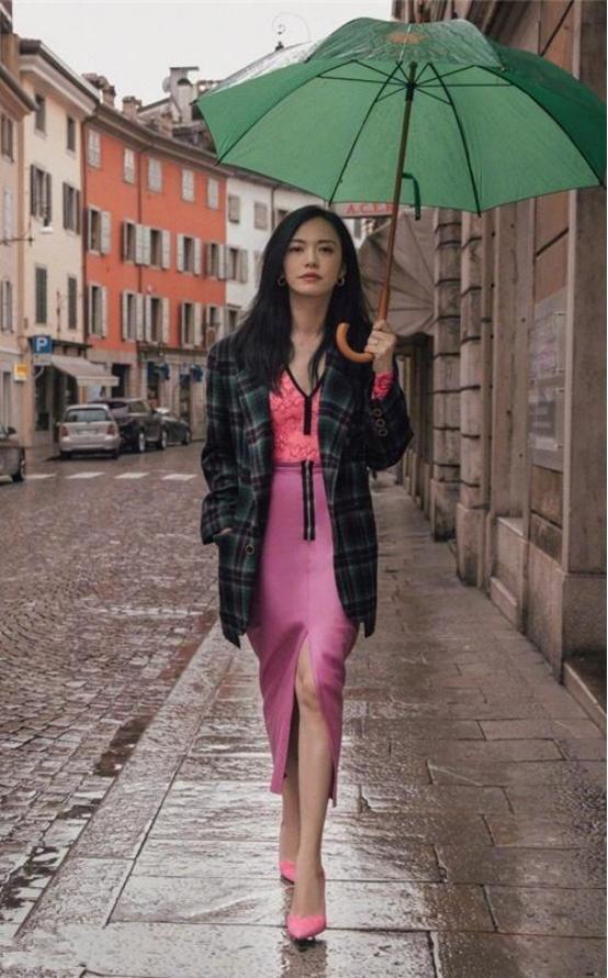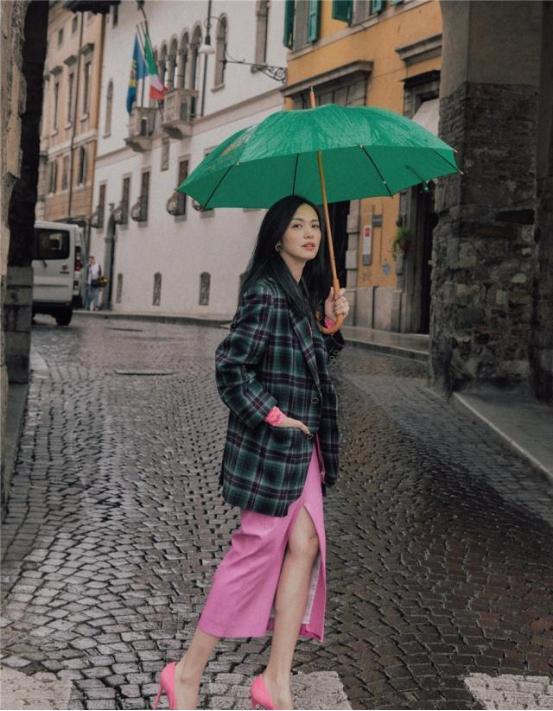 一把绿色的伞,在古老的巷子里面真是十分的招摇,看起来真是和周围的环境形成了鲜明的对比,真是有一种很独特的艺术感。姚晨的这一张照片真是拍出了时尚大片的感觉。姚晨就像是一个国际超模一样,看起来十分的有气质,真是成功的驾驭了这么奇怪的装扮,真的不愧是姚晨
