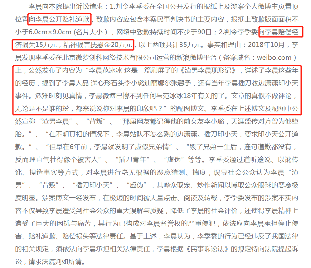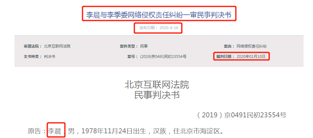 4月16日,北京互联网法院也公布了《李晨与李季委网络侵权责任纠纷一审民事判决书》,裁判日期为2020年1月10日。