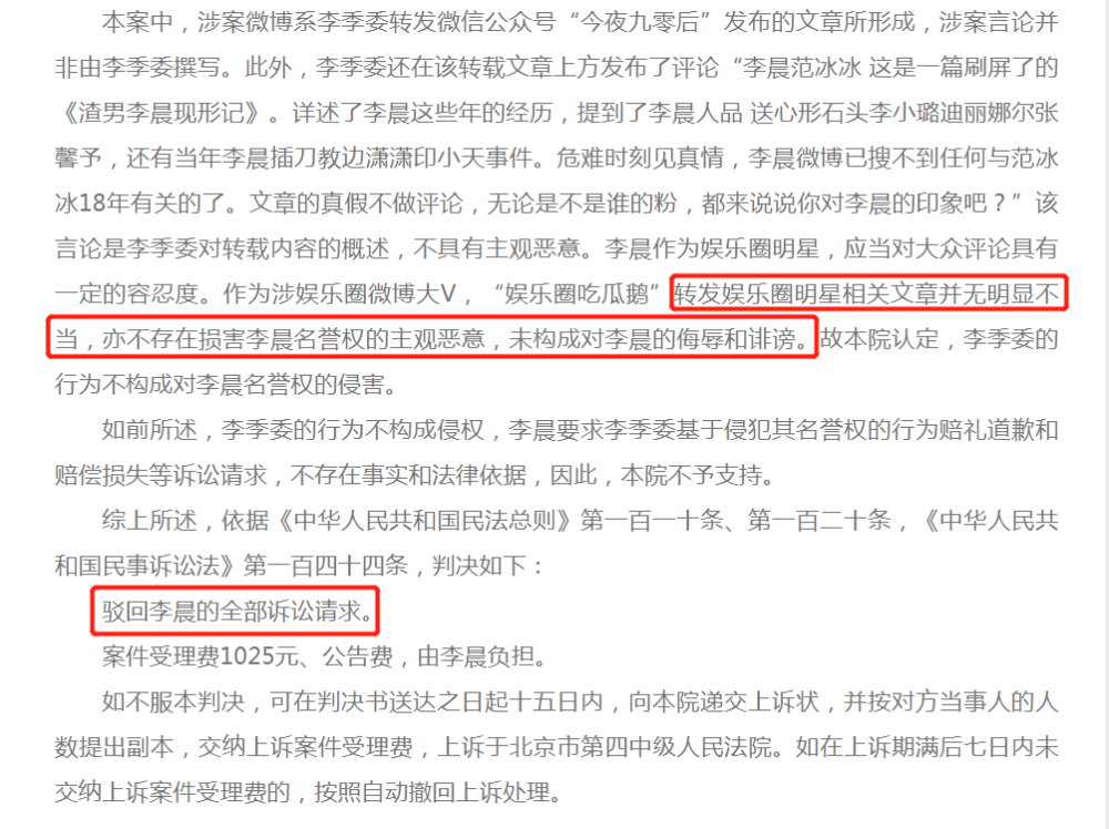 不过,法院在审理的过程中,也表示被告转发娱乐圈明星相关文章并无明显不当,亦不存在损害李晨名誉权的主观恶意,未构成对李晨的侮辱和诽谤,所以被告的行为不构成对李晨名誉权的侵害,最终法院也驳回了李晨的全部诉讼请求。