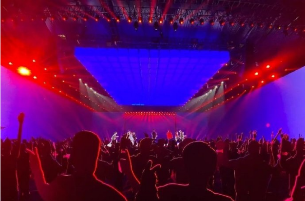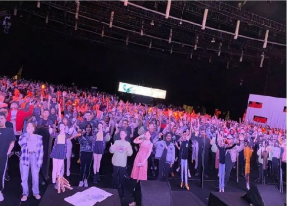 因为疫情期间不允许人群聚集,观众全用假人代替。认真工作、全身心投入歌曲的敏姐,只能对着人形立牌唱情歌。