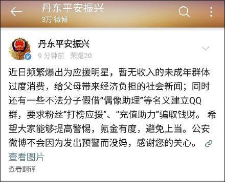 5月10日,辽宁省丹东市公安局振兴公安分局官方微博@丹东平安振兴 晒出一张被辱骂的截图,并表示:近日频繁爆出为应援明星,暂无收入的未成年群体过度消费,给父母带来经济负担的社会新闻;同时,还有一些不法分子假借“偶像助理”等名义建立QQ群,要求粉丝“打榜应援”、“充值助力”骗取钱财。希望大家能够提高警惕,氪金有度,避免上当。公安微博不会因为发出预警而没妈,感谢您的关心。