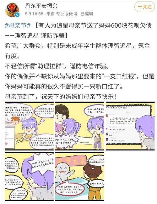 5月9日,@丹东平安振兴 晒出一组提醒广大群众,特别是未成年学生群体理智追星,谨防诈骗的漫画。@丹东平安振兴 表示,希望广大群众,特别是未成年学生群体理智追星,氪金有度。不轻信所谓“助理拉群”,谨防电信诈骗。