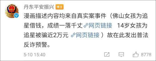5月10日下午,@丹东平安振兴 在该条微博评论区中表示,漫画描述内容均来自真实案事件,一件为《佛山女孩为追星,成绩一落千丈》,另一件为《14岁女孩为追星被骗近2万元》。