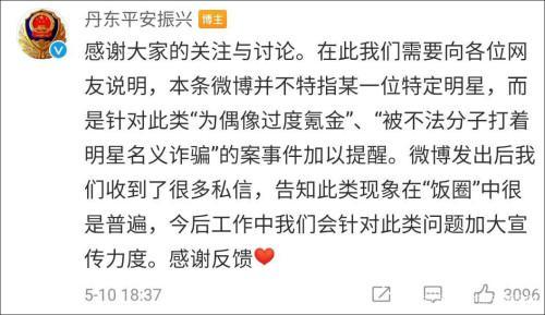 晚上,@丹东平安振兴 再一次就这件事作出回应,@丹东平安振兴 表示:在此我们需要向各位网友说明,本条微博并不特指某一位特定明星,而是针对此类“为偶像过度氪金”、“被不法分子打着明星名义诈骗”的案事件加以提醒。微博发出后我们收到了很多私信,告知此类现象在“饭圈”中很是普遍,今后工作中我们会针对此类问题加大宣传力度。