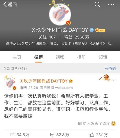 昨天晚上,肖战再度喊话粉丝:“请你们再一次认真听我说!希望所有人把学业、工作、生活,都放在追星前面。好好学习,认真工作。尽好自己的责任和义务,遵守职业规范和行业底线。我不需要应援。 ”回应了近期的粉丝应援事件。今天凌晨,杨紫点赞了肖战的这条微博。二人此前合作了电视剧《余生,请多指教》。