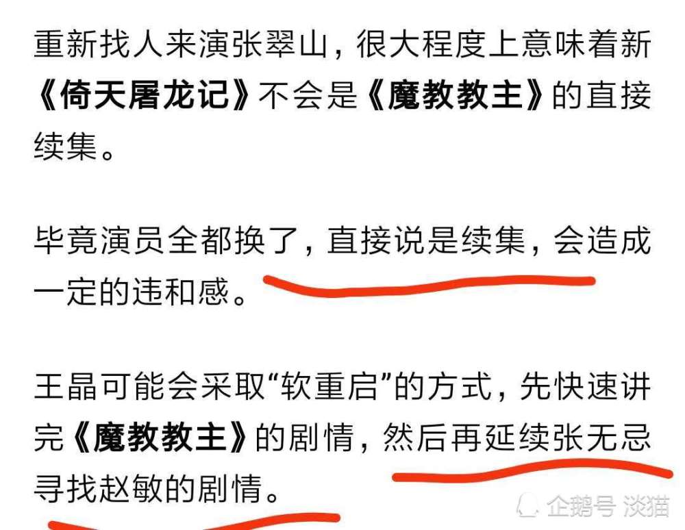 因为全演员替换,再加上时间间隔实在太长,新版《倚天屠龙记》很大程度上不会是《魔教教主》的直接续集,而是会采用“软重启”的方式,再快速讲述《魔教教主》的剧情之后,延续张无忌找张敏的剧情。