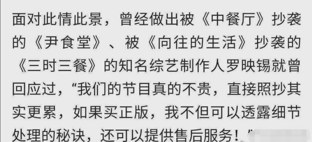罗英锡曾说过:“我们的节目真的不贵,直接照抄其实更累,如果买正版,我不但可以透露细节处理的秘诀,还可以提供售后服务!”
