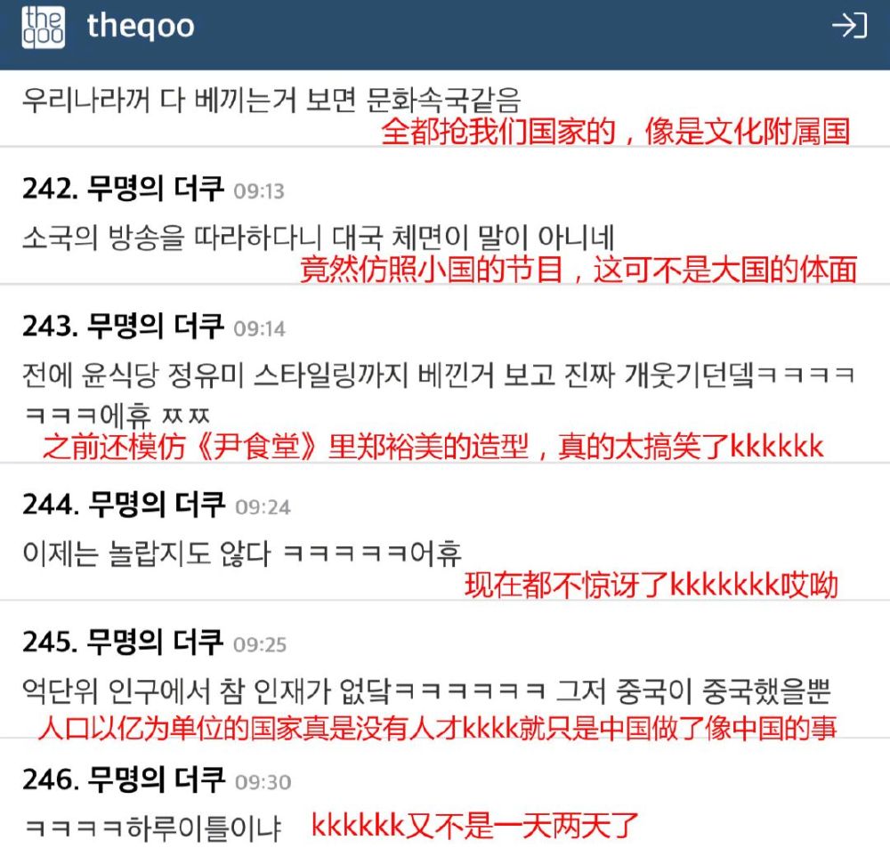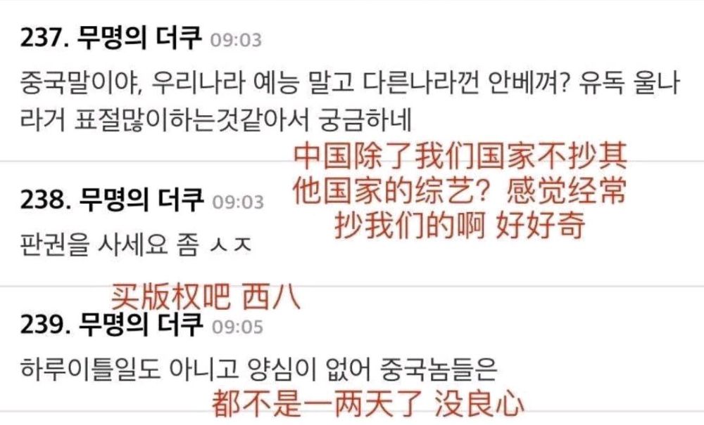 韩国网友对于极挑抄袭一事表示“模仿小国可不是一个大国应有的体面”、“全都抢我们国家的,像是文化附庸国”,言语之间的冷嘲热讽令人脸上无光。