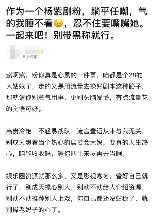 此外,该网友还教杨紫如何为人处世,说娱乐圈都是逢场作戏,别太真情实感,要和男演员保持距离,做个独立女性云云。总而言之,通过长文可以看出该网友对杨紫可以说是操碎了心,方方面面都替杨紫考虑好了,只不过就是不知道杨紫会不会看到啊?亦或者这位网友只是单方面的“我这是为你好”!