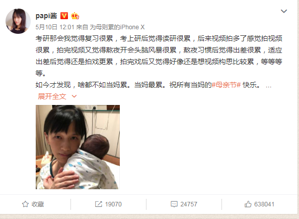 Papi在微博上透露自己当妈后的生活,更是发文感慨称,如今发现,啥都不如当妈累。当妈最累。这一句话也道出很多妈妈们的心声,并且随后配图一张抱着宝宝的合影,小家伙在她怀里看起来还是挺乖的,不过素颜的papi看起来神情还是有些憔悴的,想想妈后也是不容易呀!