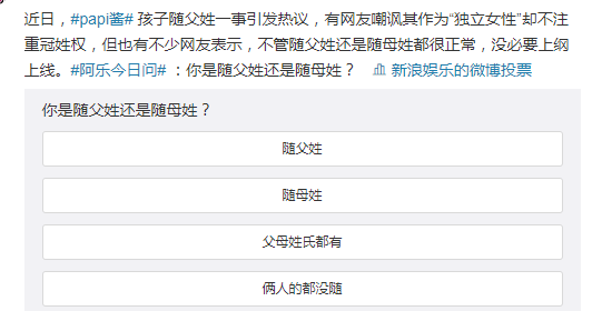 这次却因为孩子随父亲的姓而被一些网友嘲讽,不过大多数网友还是比较理智的,认为独立女性指的是思想独立,人格独立,经济独立,怎么生个孩子随父姓就不能算是独立女性了呢?