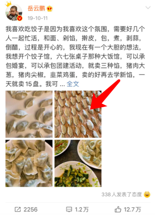 再继续往前翻看,19年9月份和10月份晒的微博也全是饺子,真的是爱吃饺子无疑了。岳云鹏也表示,“他之所以很喜欢吃饺子,是因为他喜欢吃饺子的这个氛围,需要好几个人一起忙活起来,(大家都能参与进来)和面、剁馅、擀皮、包饺子、煮饺子、剥蒜、倒醋,就是整个过程都是会让人开心的,并表示,他有一个想开饺子馆的想法,承包一些团建活动,就卖三种馅料的饺子,猪肉大葱馅饺子、猪肉煎饺馅饺子、韭菜鸡蛋饺子。”