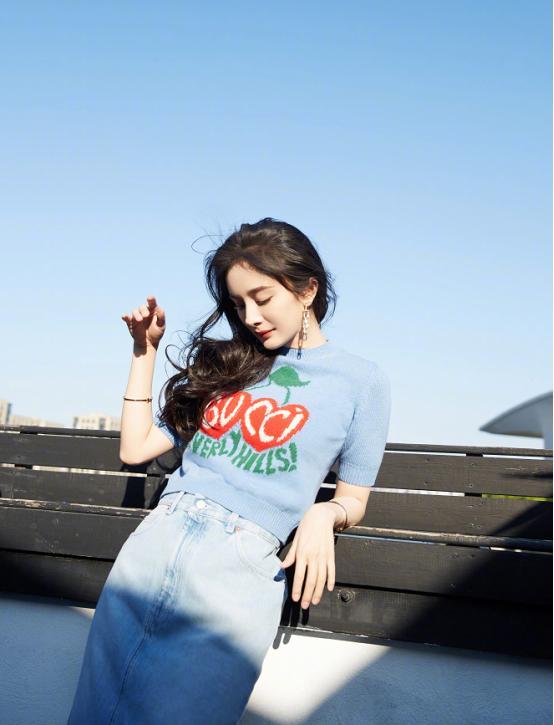 搭配着蓝色的针织衫,杨幂下身搭配的是一条半身的牛仔长裙,裙装当然是属于那种高腰的形式,这样才能让杨幂的一身曲线感变得更加的明显了一点,牛仔材质的裙装也是比较复古的了,搭配真针织衫的造型,让杨幂的慵懒变得也出明显了很多,看着还是很让人心动的了