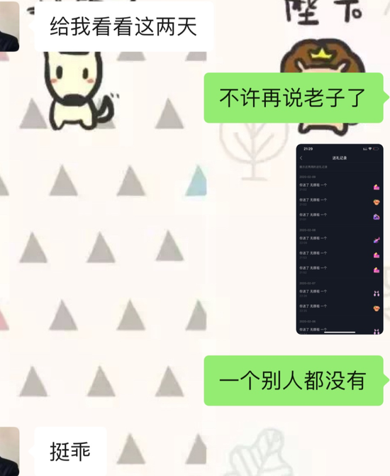 后来的两个多月里,无颜祖反反复复,只在直播间里跟她对话,平时她打语音不接、发微信不回。“但越是这样,我就越渴望他能搭理我,我会觉得只有我给他刷礼物,他才会理我。”金敏称,有时候,她在直播间给无颜祖刷两个“嘉年华”(折合6000元),才能换回他的一句回应。