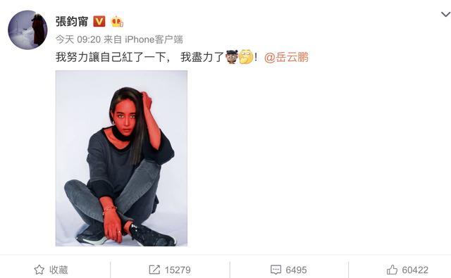 接着,张钧甯就发了一张皮肤通红的照片,配文:“我努力让自己红了一下,我尽力了。”