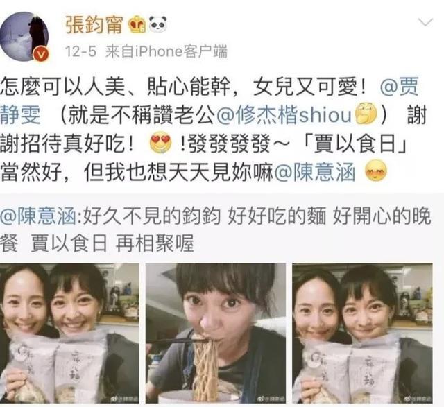 有一次,张钧甯,陈意涵,贾静雯三个人聚餐,但是陈意涵只发了和张钧甯的合照,丝毫没提到贾静雯,大家都说陈意涵太假了。