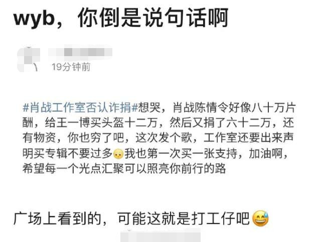 有网友称肖战在《陈情令》的片酬只有八十万,电视剧收官后肖战还给王一博买了一个价值十二万的摩托车头盔,然后又捐了六十多万还有各种物资等等,买《光点》的数字专辑也是为了帮助肖战,因为他太穷了。