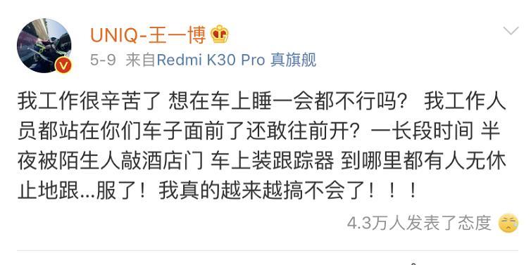 其实不只是王俊凯,相信很多明星都在饱受着私生饭的困扰。在去年因《陈情令》爆红的王一博,近日也发文抵制私生饭。王一博在很长一段时间里都被私生饭打扰,有人半夜敲他酒店的门,还有人在他的车上装追踪器。