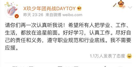 随后肖战发文表示希望所有人把学习、工作、生活放在追星前面,他希望粉丝好好学习,努力工作,尽好自己的责任和义务,遵守职业规范和道德底线,并且在文案末尾直言自己不需要应援。