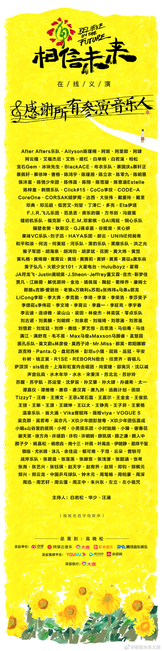 “相信未来”由阿里文娱旗下大麦联动微博、网易云音乐、虾米音乐、腾讯音乐娱乐集团共同发起,优酷担纲内容制作,130余组音乐人参演,堪称中国音乐史上最大规模的线上义演。整个义演以“对抗焦虑,回归日常”为主基调,节目形式不拘一格,流行、摇滚、民谣、古典等多种音乐形态多元呈现。