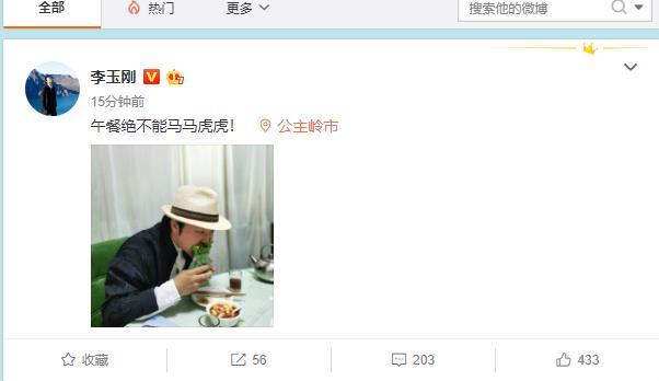 5月11日,李玉刚在微博晒出自己的近照,并表示“午餐绝不能马马虎虎!”。而眼尖的网友发现李玉刚正在吃的食物疑似时关晓彤同款的蔬菜三明治,难道李玉刚也这么赶时髦?