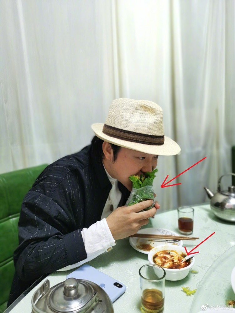 李玉刚所说的“不能马马虎虎”的午饭也是相当简单养生了。李玉刚的面前放着一小碗豆腐脑,而李玉刚手里拿着用绿叶菜包着的食物,大口大口地往嘴里送,看起来真的是很过瘾了。
