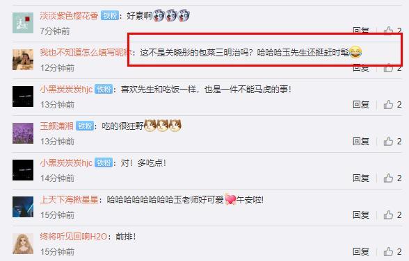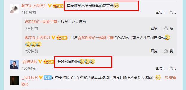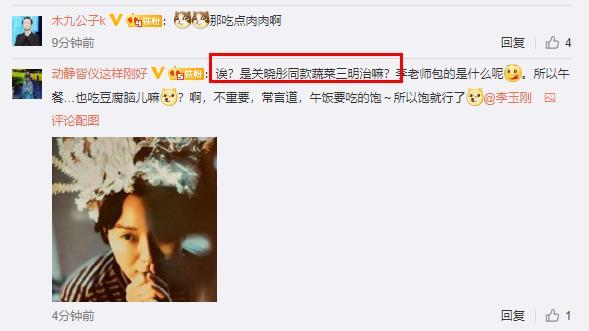 李玉刚手中的食物看起来真的很眼熟了,有点像近日关晓彤吃的蔬菜三明治。很多网友纷纷表示,“李老师是不是最近学的蔬菜卷”、“关晓彤同款吗?”、“诶?是关晓彤同款蔬菜三明治吗?”、“这不是关晓彤的包菜三明治吗?哈哈玉先生还挺赶时髦”。