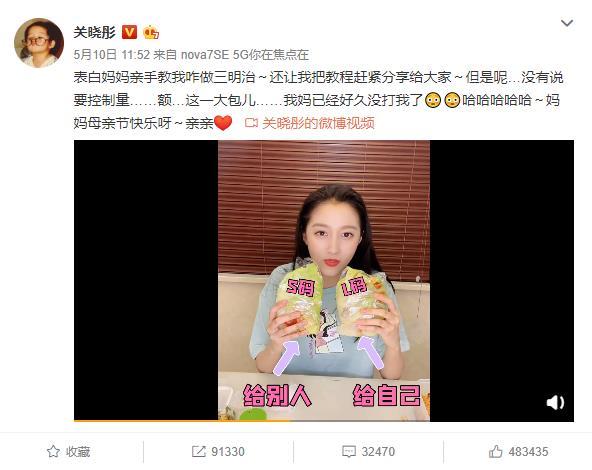 5月4日,关晓彤曾在微博晒出自己的个人vlog,在视频中关晓彤变身吃播博主,在线吃蔬菜三明治。一时之间很多网友纷纷种草关晓彤的蔬菜三明治。