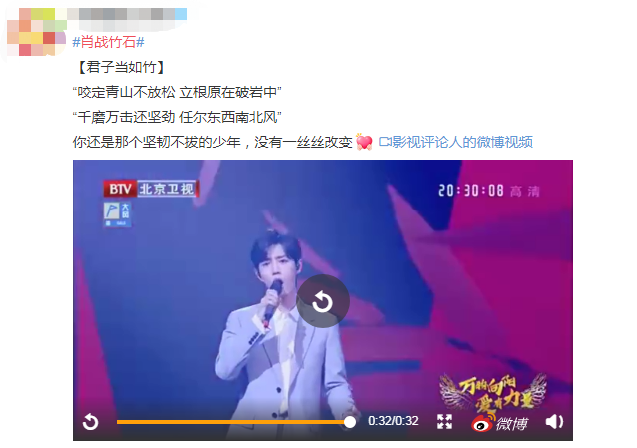 这也是肖战277事件后的首个舞台表演。虽然肖战上北京卫视并没有什么宣传,不过当晚夸赞肖战的微博可不少,肖战为此也上了热搜。只是这微博内容也都千篇一律,“肖战当如竹”、“坚韧不拔”、“你还是那个少年”等等。