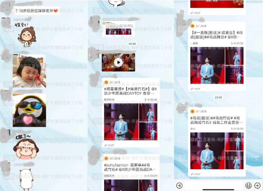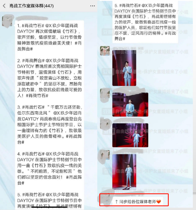 随后有网友爆出肖战团队买通稿的聊天截图,在一个有447人的肖战工作室媒体群,工作人员给大家发了5条示例微博,并附上了肖战的高清美图,表示同步给媒体老师们。
