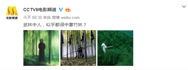 而且现在很多人都喜欢人云亦云,那么多人都说好那这就一定好的。不过最有梗的还是CCTV6电影频道今日突然发布了一条微博,“武林中人,似乎都很中意竹林”。