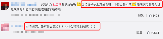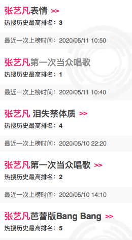 再来看看她的热搜词条:张艺凡表情,张艺凡第一次当众唱歌,张艺凡泪失禁体质,张艺凡芭蕾舞bangbang,都是鸡毛蒜皮的小事,却占据了热搜榜单十分靠前的位置。