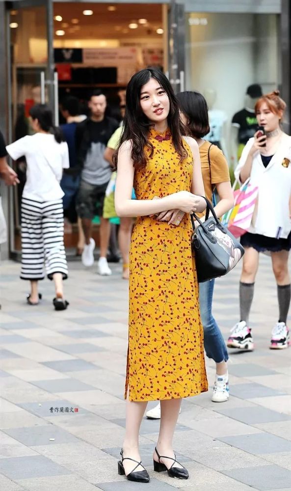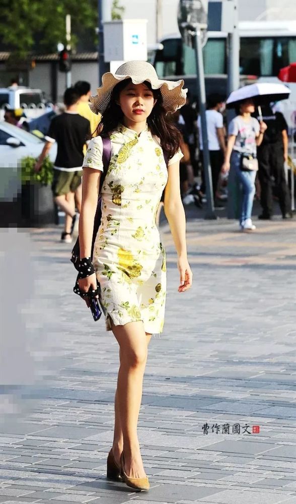 10.日常款的旗袍最实用,也是美女选择最多的。材质多用纯棉、棉麻、混纺面料和真丝类。这些面料具有轻便好穿、好清洁打理、价格亲民等优点。样式上,美女多选择短款样式,长度与短款连衣裙差不多,但是,在显身材方面,旗袍的效果要好很多。戴草帽的美女,选择纯棉花布的旗袍,面料是象牙色的底色,上面有黄色的团花花卉和绿色的叶子,非常素雅大方。这件旗袍采用最简洁的样式,短款、短袖,修身,美女搭配一双柠檬黄色的高跟皮鞋,佩戴一顶边缘有荷叶边装饰的大檐草帽,这个搭配,凸显身材曲线,还有满满的青春气息,更不乏浓浓的女人味儿。
