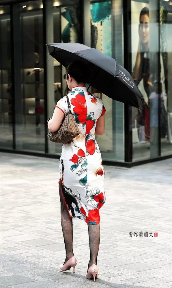7.这个美女的旗袍也是走高端路线的,它是以拷纱为面料。拷纱也叫香云纱,是纯天然的面料,要经过40多道手工工艺的操作,才能生产出这个面料。拷纱硬朗华丽,透气性非常好,非常凉快,是很有高级感的服装面料。美女穿了