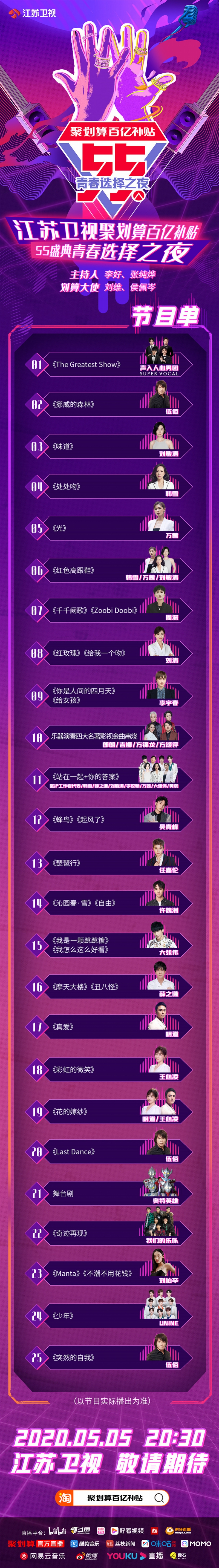 南都讯 记者黄晓雅 实习生蔡敏“青春由磨砺而出彩,人生因奋斗而升华。”5月5日20:30,“江苏卫视55盛典青春选择之夜”即将播出。十大青春主题串联节目编排,李宇春、伍佰、刘涛、周深、任嘉伦、吴青峰、郎朗、吉娜、大张伟、薛之谦、明道、王心凌、刘敏涛、韩雪、万茜、刘柏辛、许魏洲、UNINE等或上演个人秀,或跨界合作,或混搭创意,将“好看、好听、好玩、好购”集于一体。