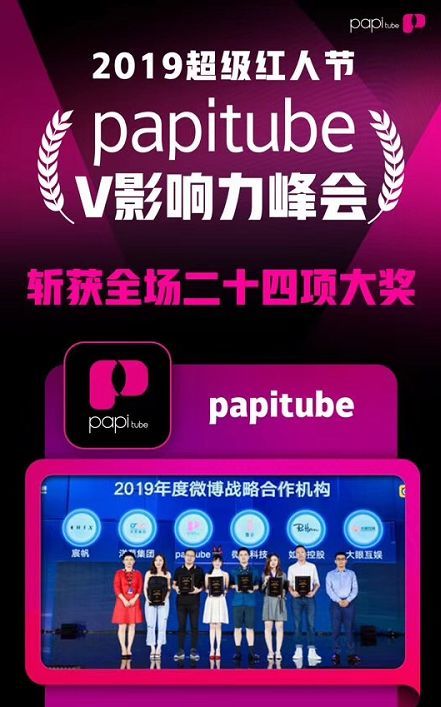 他们总共抱走了24项大奖,其中papitube获得了“微博2019年度战略合作机构”等8个奖项,旗下papi酱、Bigger研究所、滇西小哥等多位红人也纷纷斩获奖项。